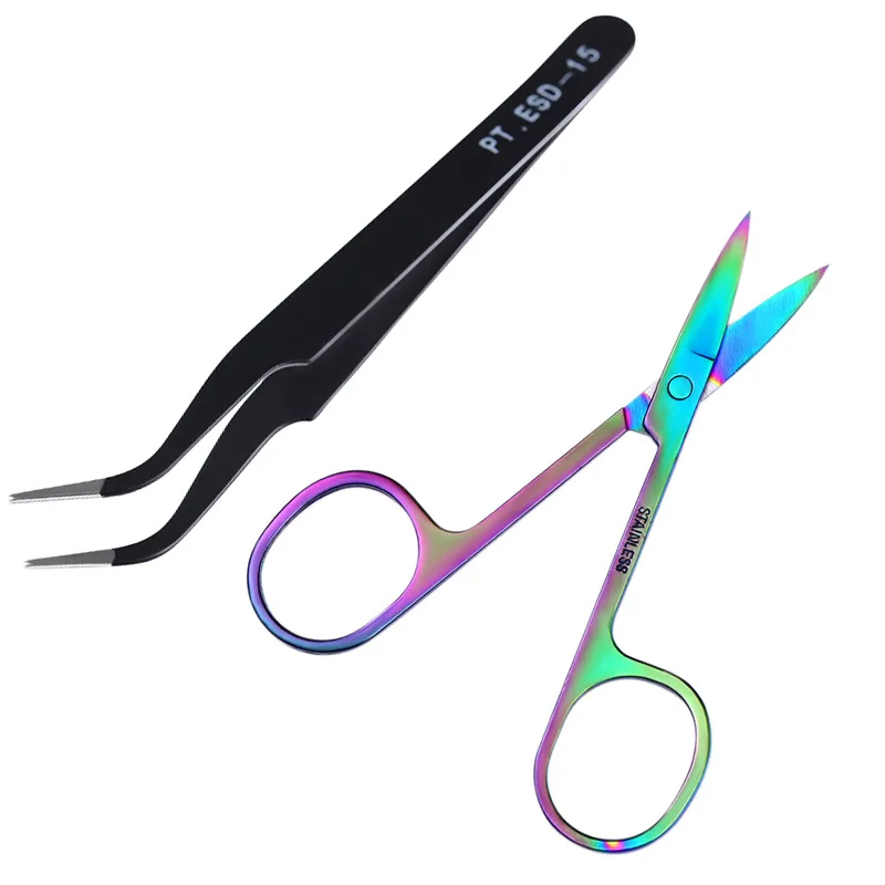 Hot Sale 2 Pc Curved Stainless Steel Tweezer with Scissor Eyelash Nippers Sticker Rhinestone Picker Face Tri